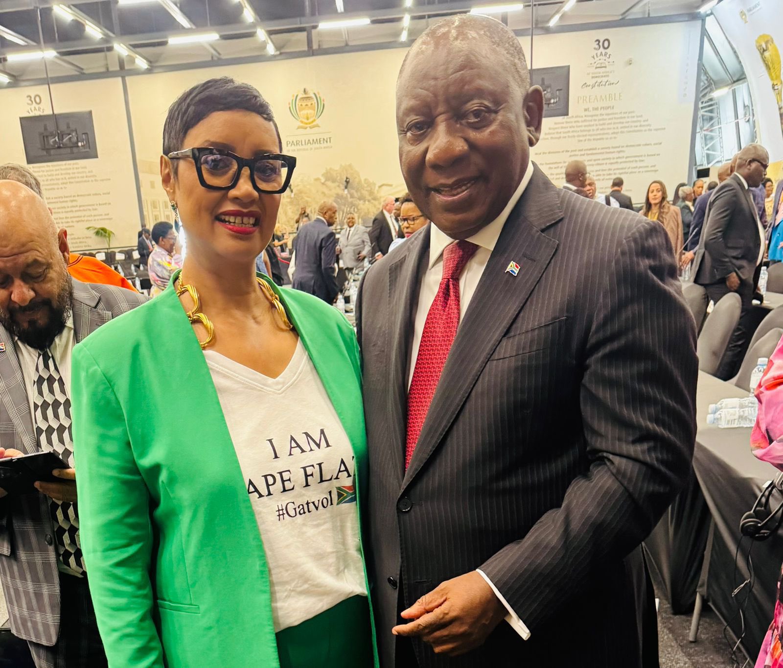 Online platforms were filled with debate this week after a photo of Cyril Ramaphosa standing alongside Dereleen James began circulating widely. The image, showing the President smiling next to James, prompted strong reactions across the political spectrum. Some commentators questioned the optics of opposition representatives being photographed with the head of state, suggesting it could be interpreted as an attempt to gain visibility or approval.