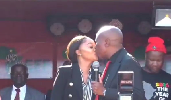 Addressing a lively crowd, Malema introduced his family with characteristic flair before jokingly asking: “This is my wife, must I kiss her, you want her to say something?” The remark sparked amusement among supporters, momentarily shifting the tone from politics to a more intimate and relatable exchange.